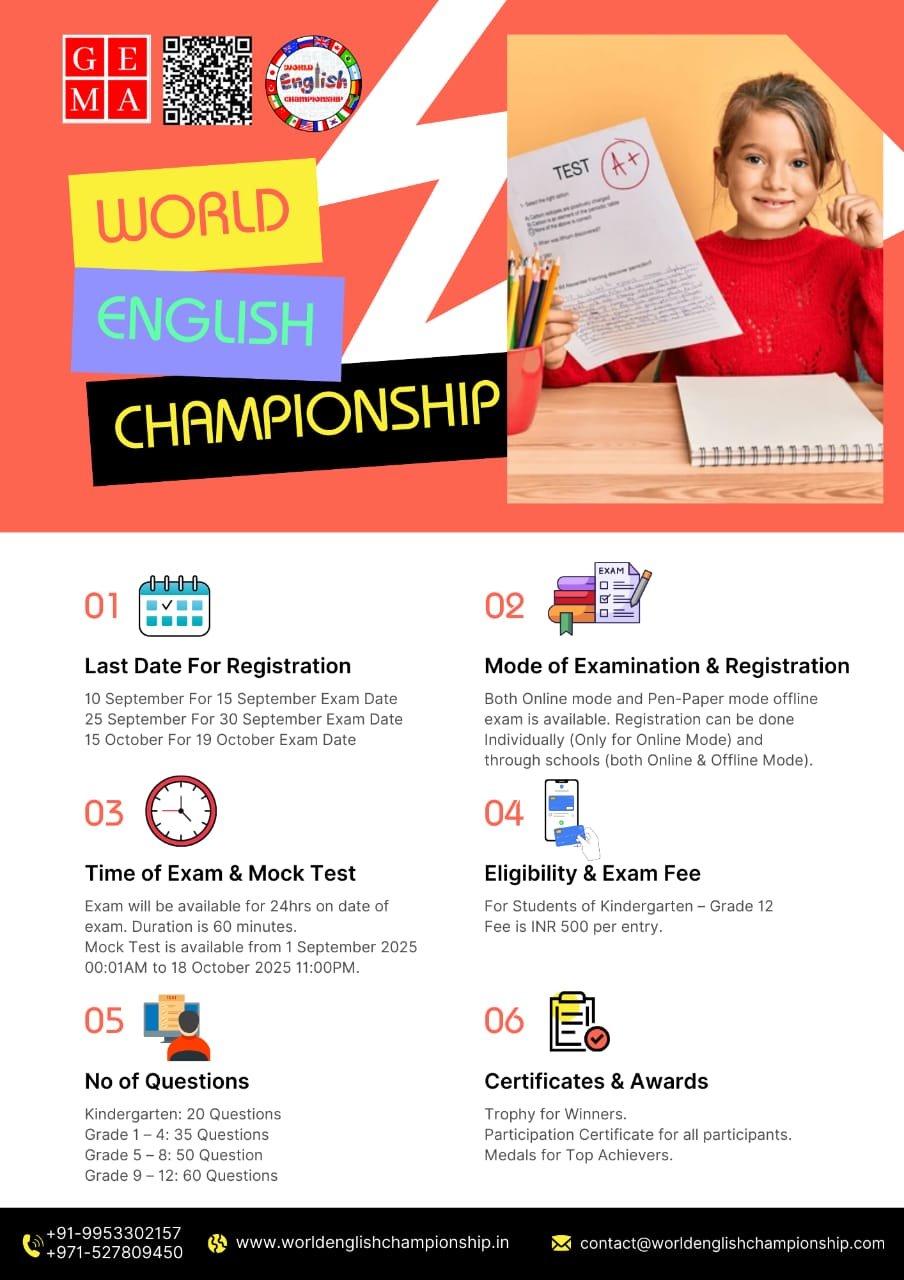 Welcome to the World English Championship: Join us in unleashing the power of English! At the World English Championship, students, educators, and enthusiasts alike have the opportunity to showcase their skills, gain global recognition, and build confidence through engaging competitions. Beyond competition, our vibrant community fosters collaboration, offers bootcamp opportunities, and prepares participants for success in the future workforce. Through inspiring challenges and real-world applications, we ignite a passion for lifelong learning and problem-solving. Whether you’re a budding English Scholar or a seasoned pro, there’s a place for you in our world-class platform dedicated to transforming lives through English. Join us and embark on a journey of discovery, learning, and limitless possibilities.